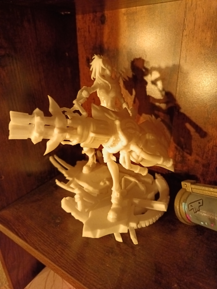 A pale, possibly 3D-printed, female figure wielding a large gun is the main focus. She stands atop a detailed, circular base. The figure is placed on a wooden shelf within a dimly lit cabinet. To the right, a cylindrical object with teal and gold accents is partially visible. A distinct shadow cast by the figure is noticeable on the back wall of the cabinet.