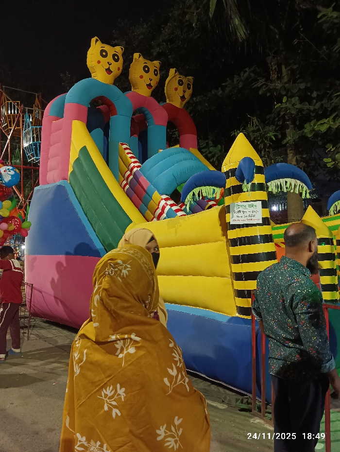 The image displays an outdoor nighttime scene at a fair or carnival in Dhaka, Bangladesh. A prominent, multi-colored inflatable structure, likely a bounce house or slide, dominates the midground. This structure features large sections in yellow, blue, pink, and green, topped with three yellow cartoon cat-like heads. A separate yellow conical inflatable section, striped horizontally in black, stands to the right and bears a white sign with Bengali text indicating an "Entry Fee 50/- per 20 minutes." In the immediate foreground, facing away from the camera, is an individual wearing a mustard yellow hijab with white floral patterns. Behind them, a person in a light brown hijab and a black face mask is partially visible. To the right, a bearded man in a dark green patterned shirt and dark trousers stands with his back to the viewer, observing the inflatable attraction. In the left background, another individual dressed in a red long-sleeved shirt and dark pants is visible near a cluster of balloons, including a blue Doraemon character balloon. A portion of a Ferris wheel is discernible in the far left background. The ground is paved, and the dark background contains silhouetted foliage, illuminated by artificial light sources. A digital timestamp of "24/11/2025 18:49" is present in the lower right corner.