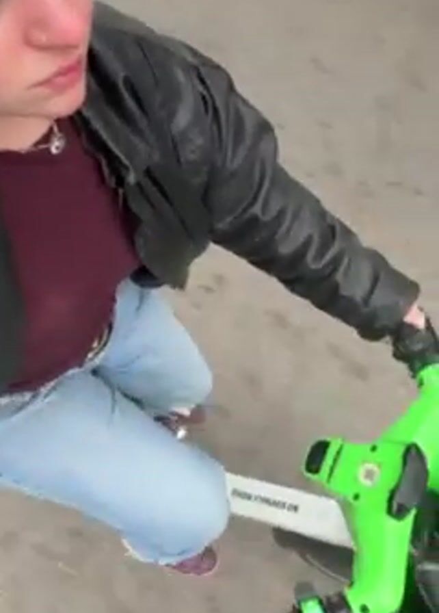 A young woman with reddish-brown hair rides a Lime scooter in an outdoor environment. She wears a black leather jacket, a dark burgundy top, and light blue jeans. The scooter is green and white, and there is a black bag in its basket. The pavement is gray and appears to be marked with faded parking lines. The view is from the perspective of the person riding the scooter. The camera tilts slightly as the scooter moves along the pavement. Overhead, trees can be seen.