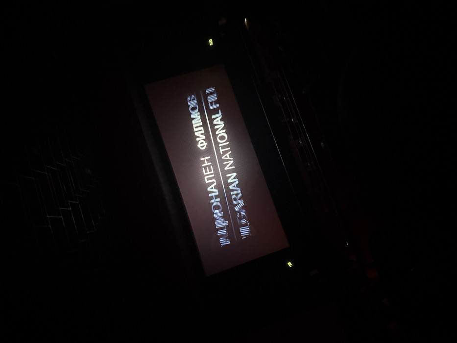 A darkened cinema auditorium in Sofia, Bulgaria, features a large screen displaying white text against a dark red background