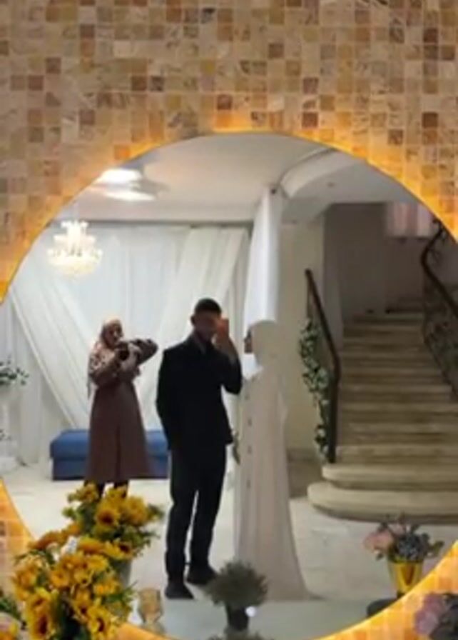 mirror’s reflection of a wedding scene. A man in a black suit takes a selfie with a woman in a white wedding dress and hijab. Behind them, another woman wearing a headscarf and a brown coat is taking photos with a camera. The background includes white curtains, a blue bench, a staircase decorated with flowers, and sunflower arrangements. The mirror itself is framed with decorative mosaic tiles and lights. The room is well-lit and appears to be indoors.