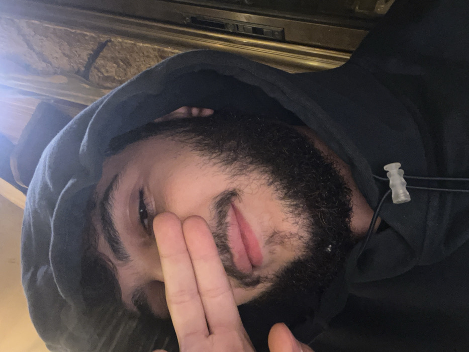 A close-up, angled shot shows a person wearing a dark hoodie with the hood up. Part of the face is visible, including an eye, a full beard, and a glimpse of the tongue. A hand is positioned near the face. The background includes a textured wall with a small metal vent. A clear plastic piece attached to a wire is visible on the right side of the frame. The image is slightly rotated.