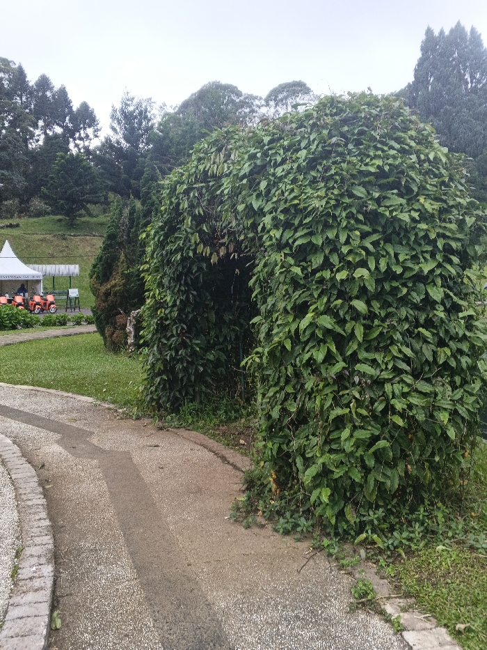 This image depicts an outdoor park or garden scene within the city of Kadoma, Zimbabwe. The foreground features a light-colored, textured paved pathway that curves from the lower left towards the right, bordered on its left edge by a low, segmented stone or brick barrier. The prominent central subject is a large, arch-shaped structure completely covered in dense green foliage, forming a natural archway or tunnel. To the left of this archway and beyond the pathway, a manicured grassy area is visible. In the midground on the left, a white canopy tent with a pointed roof is present. Beneath this tent, a row of approximately four small, orange, three-wheeled recreational vehicles are parked. A white sign with green lettering is also visible near the tent. The background is characterized by a dense canopy of various trees, indicating a forested or heavily vegetated area, under an overcast, light gray sky. No human figures or explicit activities are depicted.