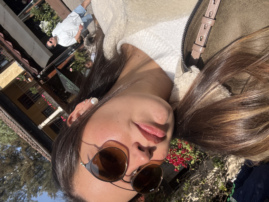 - "A woman is seen from a tilted perspective, wearing sunglasses, with dark hair highlighted with light brown streaks" by FM-mkaXg2, licensed under CC BY 4.0