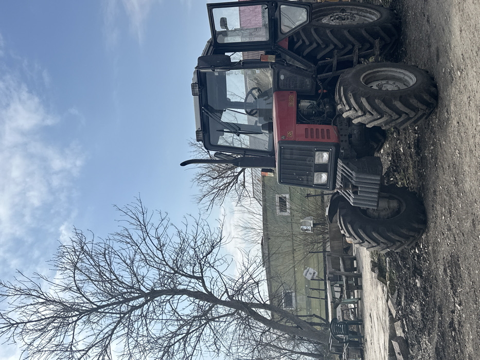 The scene is an outdoor environment in the city of Voluyak, Bulgaria, depicted under a blue sky with scattered white clouds. A red and black Belarus 952 agricultural tractor is the dominant subject, positioned in the center-right foreground and angled slightly towards the left. The driver's side door of the tractor is open. Its exhaust pipe extends vertically from the left side of the cab. The ground in the immediate foreground and beneath the tractor consists of dark, uneven soil and scattered debris. To the left of the tractor, a large, leafless deciduous tree stands prominently, with its bare branches reaching into the upper left quadrant. In the mid-ground, situated behind the tree and to the left of the tractor, is an olive-green, elongated, possibly modular building featuring multiple small rectangular windows. A wooden picnic table with benches and a single green plastic chair are located in front of this building. A white, bowl-shaped object mounted on a pedestal is also visible near the building. No human subjects are present in the image.