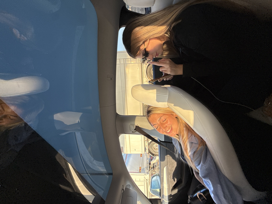 The scene takes place inside a vehicle in Kefar Sava, Israel. The vehicle, identifiable as a Tesla by its interior design and panoramic glass roof, contains two young adult females in the rear passenger seats. Bright sunlight illuminates the interior. On the left, a female with long blonde hair, wearing a light blue long-sleeved top, is reclined in a white passenger seat. Her face is directly exposed to the sun, her eyes are closed, and she exhibits a broad smile. A black bag with a gold-colored clasp is positioned beside her. On the right, a second female with long brown hair, wearing dark sunglasses and a dark long-sleeved top, sits upright. She holds a smartphone in both hands, appearing to operate its camera and pointing it towards the first female. Her left index finger is extended. Through the vehicle's windows, large white commercial vehicles (trucks or trailers) are visible in the background, suggesting an industrial or logistics area. A reflection of a person, likely the photographer, is visible in the panoramic glass roof.