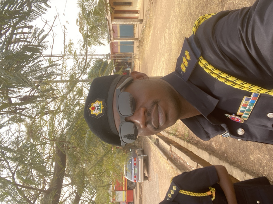 An outdoor, daytime image taken in Unguwan Dosa, Nigeria, features a male individual in a dark uniform posing for a selfie