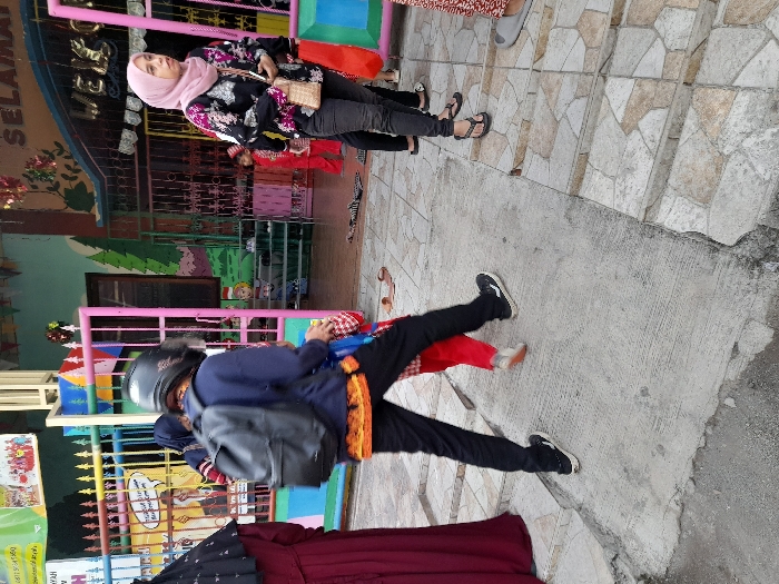 A daytime scene in Ngampelsari, Indonesia, captures the entrance area of a brightly decorated building, likely an educational facility. In the central foreground, a person wearing a black motorcycle helmet, a dark blue long-sleeved jacket over an orange patterned shirt, black trousers, and black sneakers, walks up a concrete ramp, carrying a black backpack. A small child in red pants and a red top walks slightly ahead and to the left of this person. To their immediate right, a woman stands on a series of decorative tiled steps. She wears a light pink hijab, a black long-sleeved top with a floral pattern, black trousers, and dark sandals, carrying a small light-brown woven bag cross-body and a red bag in her left hand. She is looking towards the left. On the far left, partially visible, is a person wearing a dark red or maroon abaya, facing away from the camera. The building entrance features an open, colorful metal gate with pink vertical bars and multi-colored accents, beyond which a light blue wall with painted green trees is visible. Above the entrance, a sign displays "SELAMAT DATANG" and "WELCOME," adorned with red and yellow festive garlands. Inside the entrance, two children in red clothing are discernible, one standing, one appearing to be on the floor, near a multi-tiered metal shoe rack. To the left of the entrance, a green banner and a yellow banner with text and an image of a speaking man are displayed. The concrete ramp in the foreground appears damp, leading up to the multi-toned grey and brown tiled steps.