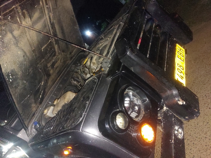 The scene, located in Msata, Tanzania, depicts the front left section of a dark-colored utility vehicle, consistent with a Land Rover Defender, at night