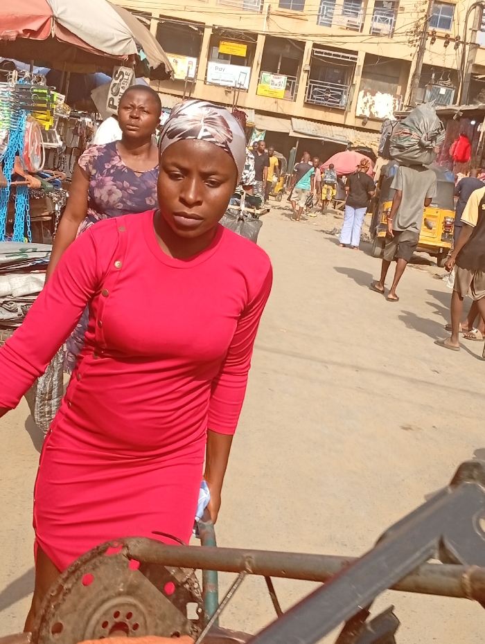 The image depicts a bustling street scene in Fegge, Nigeria, under bright daylight. In the immediate foreground and slightly to the left, a woman of African descent is centrally positioned, facing the viewer with a neutral expression. She wears a form-fitting, long-sleeved red dress and a patterned headscarf. Her right hand appears to grip a metal bar, part of an unidentifiable structure in the lower right foreground. Behind her, to the left, another woman with short dark hair wears a dark floral dress, standing near market stalls displaying various goods, including hanging items and a light-colored umbrella canopy. The background reveals a busy street with numerous pedestrians. One individual is seen carrying a large, dark bag on their head. A yellow motorized tricycle (keke napep) is partially visible on the right. Multi-story commercial buildings with multiple windows and various signage, including "POS AVAILABLE" and "Pay," line the street, indicating a commercial district. The street surface is paved and appears dusty.