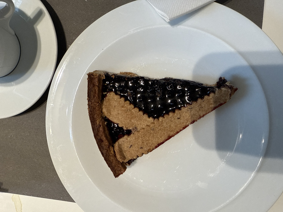 An overhead photograph captures a triangular slice of tart centered on a white ceramic plate. The tart possesses a brown, firm crust, and a dark, glistening berry filling. A decorative scalloped edge of crust overlays the filling, creating a heart-like outline on the left side. Partially visible in the upper right is a white ceramic coffee cup positioned on its matching saucer. A folded white paper napkin rests adjacent to the main plate on the right. The items are situated on a dark grey tabletop surface. This indoor scene, consistent with a cafe or restaurant, is located within Venice, Italy.