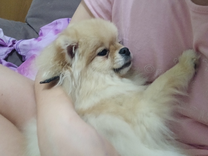 A fluffy, light tan dog with dark eyes rests in a person's arms. The dog's head is turned to the side, and one of its paws is visible near the person's chest. The person is wearing a light pink shirt. The scene seems to be indoors. A couch with a tie-dye blanket is partially visible in the background.