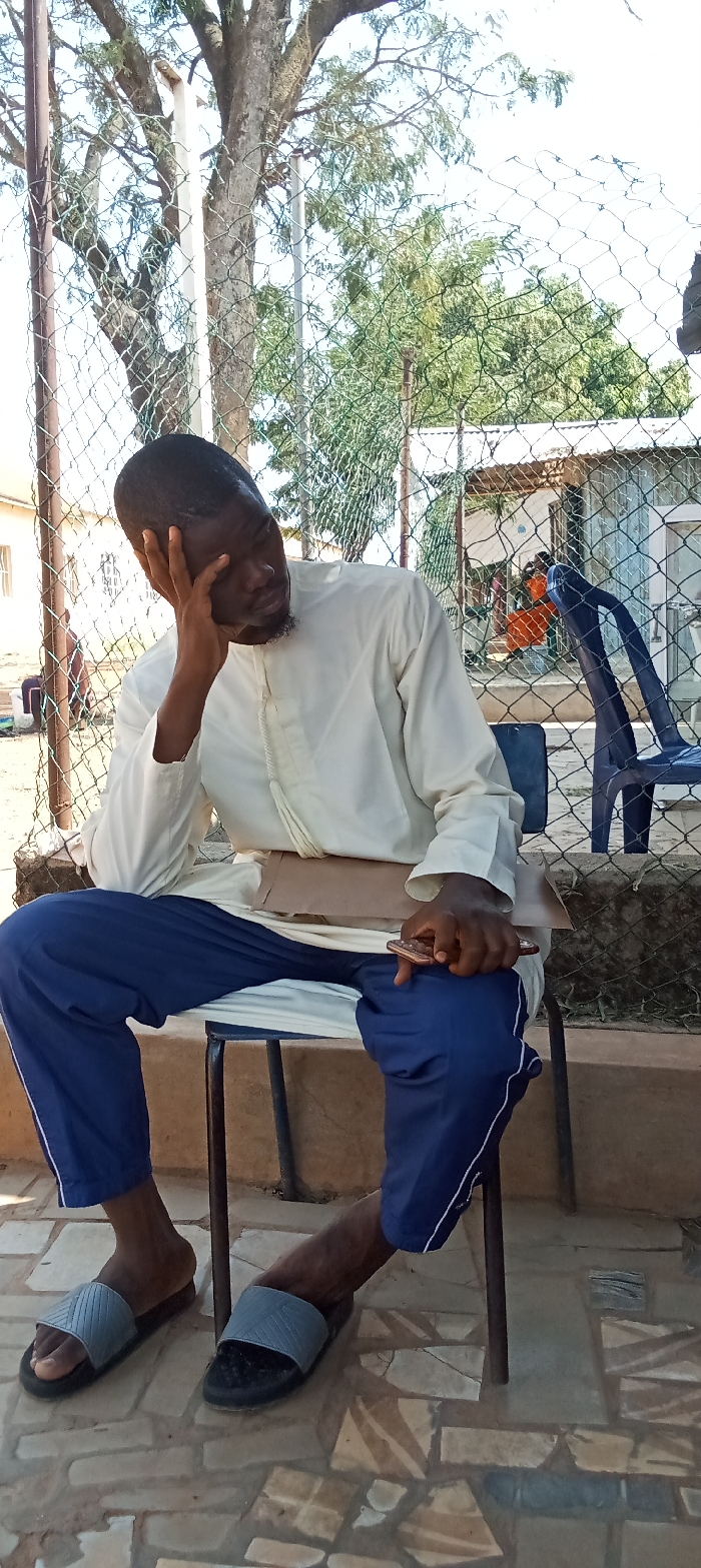 An adult male with dark skin and a short beard is depicted seated outdoors in Kinkinau, Nigeria