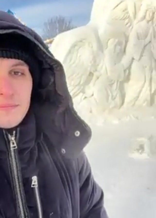 A person in a dark jacket and hat is standing in a snowy area. Behind them are several snow sculptures, including one depicting religious figures. A building with a blue roof and a golden dome is also visible in the background. The sky is bright. The person appears to be taking a selfie or video, panning the camera across the snow sculptures and the landscape.