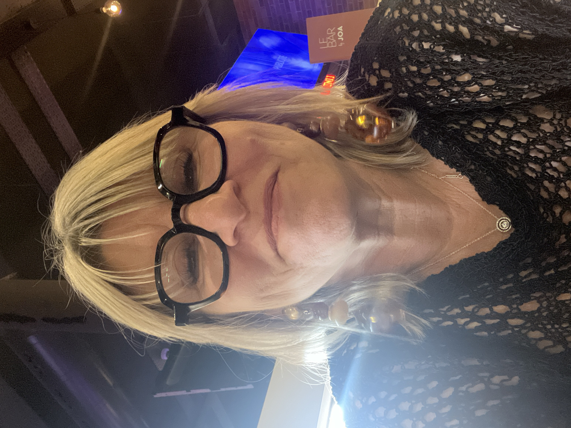 A portrait of a blonde woman wearing eyeglasses and a black lace garment. The background includes a blue light and a sign that reads "LE BAR by JOA". The location is Montrond-les-Bains, France.