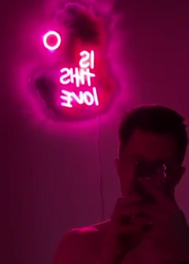 A man is taking a selfie in front of a pink neon sign that reads "Is This Love?" The man is fair-skinned with short, dark hair and is wearing glasses. He appears to be shirtless. He is holding a phone up to his face, obscuring some of his features. The room is dimly lit with a pink hue due to the neon sign. The sign is shaped like a blob or a misshapen heart with a circle at the top. A cord is visible coming from the sign.