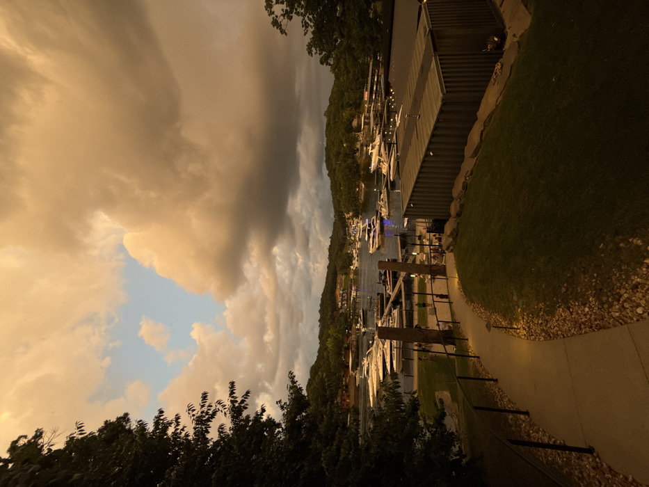 This image depicts a marina and lake environment at dusk in Osage Beach, United States