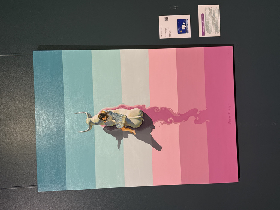 This forensic description details an artwork displayed on a dark grey wall in the Private Temp Gallery in Minsk, Belarus