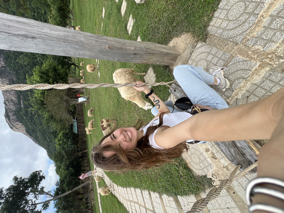 A woman in light blue jeans and a white top smiles, holding a rope swing. A sheep stands beside her on green grass. A few other sheep graze in the background. The scene takes place outside with a large rock formation and trees on one side, and a brick pathway on the other.