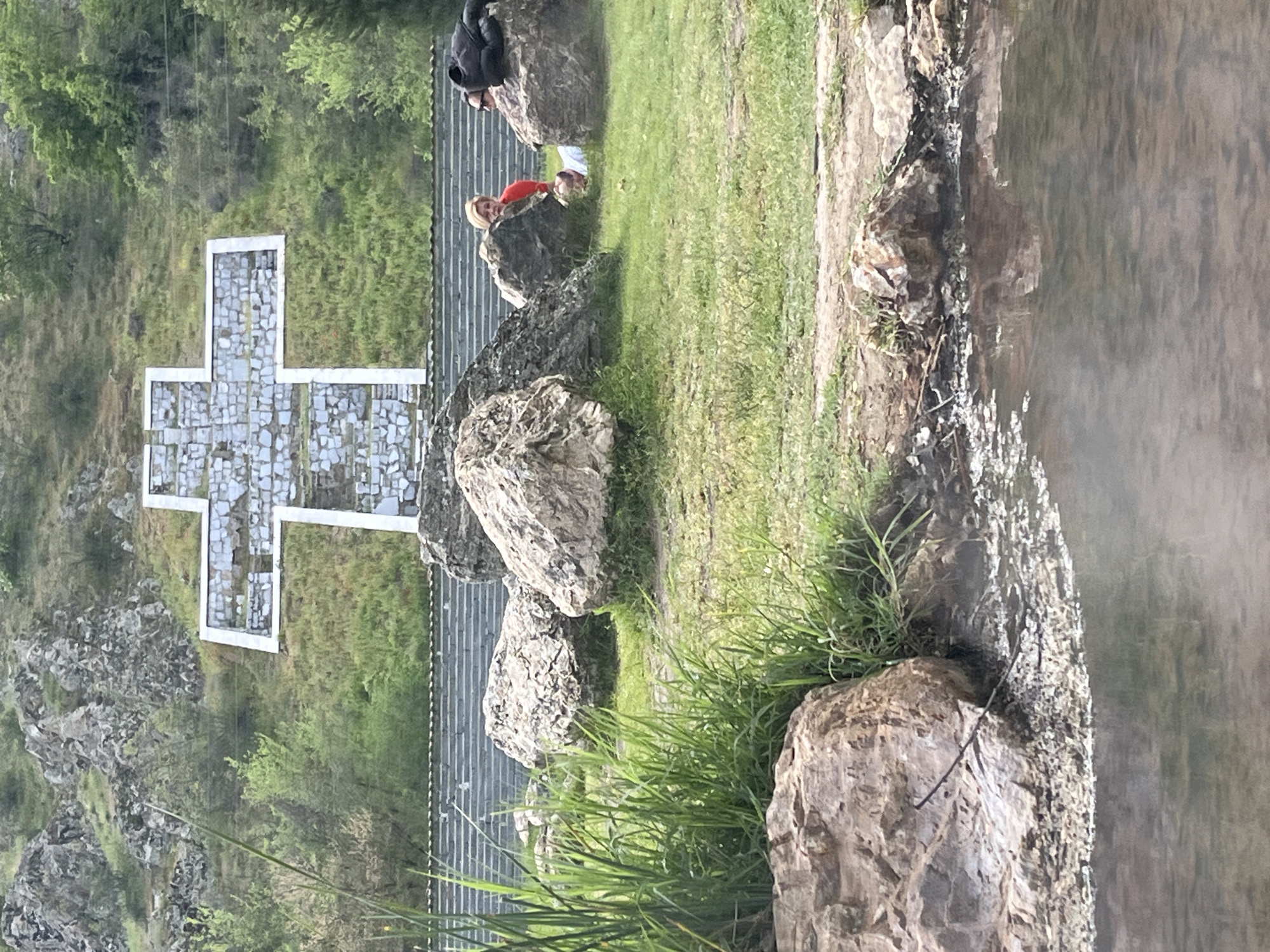A cross made of white stone sits on a hillside in General Todorov, Bulgaria. The scene includes people sitting on the rocks and grass, and there is also a small body of water nearby.