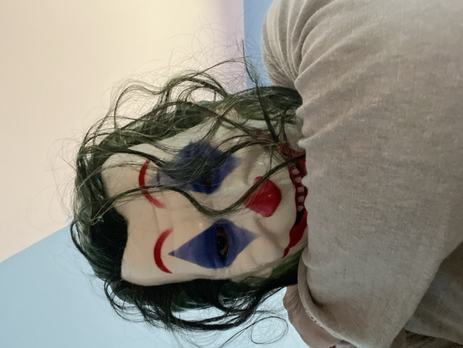 A single individual is depicted in a close-up, low-angle photograph within an indoor setting in Ouaouizert, Morocco. The subject is wearing a full-face mask designed to resemble the Joker character, featuring a pale white base, red arched eyebrows, a wide red smile, and blue diamond shapes painted under the eyes. Disheveled dark green synthetic hair is attached to the mask. The individual's right eye is visible through the mask's eye opening. A light-colored, likely beige or light grey, long-sleeved garment is worn, showing folds around the neck and shoulders. The background consists of a wall divided diagonally into two distinct colors: light blue on the left and a light beige or off-white on the right.