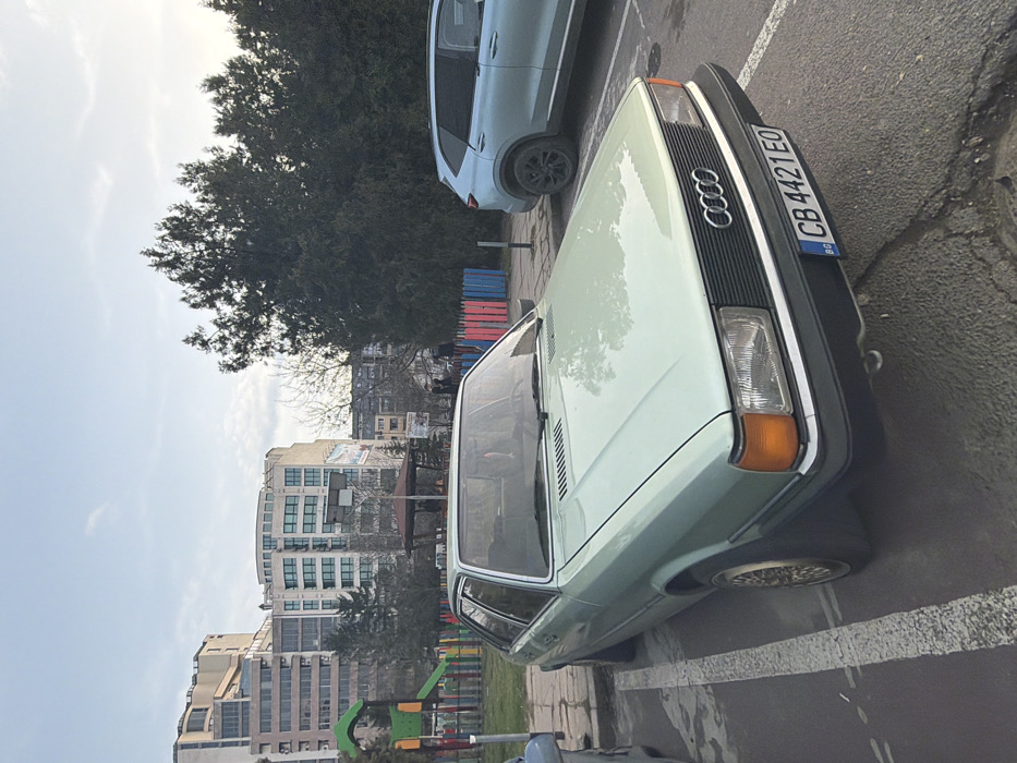 The image depicts an urban scene in Sofia, Bulgaria, identifiable by the "CB" regional code on the front license plate of the primary vehicle. A light green (mint green) vintage two-door Audi Coupe, likely a B2 generation model, is parked in a marked asphalt parking space, facing forward. The vehicle exhibits Bulgarian license plate "CB 4421 EO" on its front bumper and is fitted with gold-colored multi-spoke wheels. The asphalt ground displays visible cracks and worn white parking lines. To the right of the Audi, a portion of a light blue modern SUV with dark wheels is visible, parked further back. A small section of another vehicle is partially visible on the far left. Beyond the parking area, a low fence constructed from vertical wooden planks in alternating red, blue, pink, and yellow colors separates the parking lot from a green space. Within this green space, a children's playground structure featuring a green slide and orange elements is visible. A hexagonal gazebo with a brown roof stands near the playground, with several indistinct human figures present around and within it. Dense, dark green coniferous trees are prominent on the right side of the frame, alongside several bare deciduous trees. The background features multiple multi-story buildings. On the far left, a tall, light-colored building with several setbacks is visible. In the center, a prominent modern building with a curved facade and numerous light green-tinted windows dominates the skyline. Older, darker residential blocks are also visible further in the background. The scene is illuminated by ambient daylight under a clear, light blue sky with scattered white clouds. Additional indistinct human figures are visible walking or standing in the distant background.