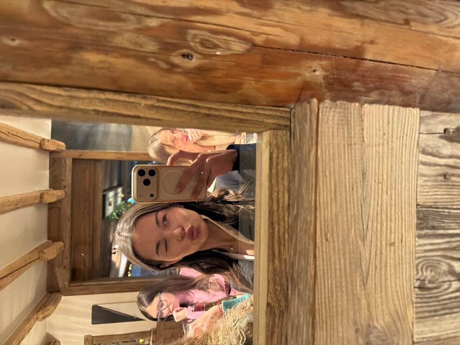 A mirrored selfie captures a young woman winking at the camera, holding a smartphone with a neutral-colored case. Reflected behind her are two other women seated at a table, one wearing glasses and a pink top, the other with blonde hair. The mirror is framed with rustic wood, with similar wood paneling visible above. The environment appears to be a cozy, wood-paneled interior, possibly a restaurant or cabin.