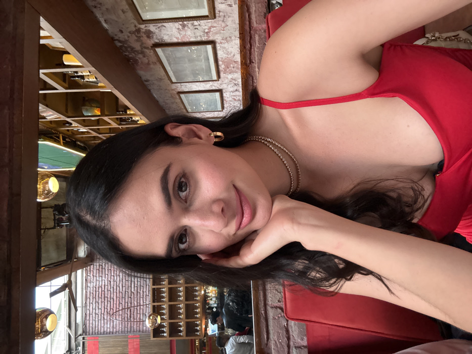 - "A woman with dark hair and fair skin leans into her hand, posing in a red dress with delicate straps" by FM-93COq2, licensed under CC BY 4.0