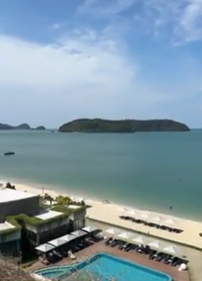 scenic view from a high vantage point of a resort with multiple swimming pools, a beach, and the ocean with a small island in the distance. The sky is blue with scattered clouds. In the foreground, there's a view of the lower pool area of the resort with beach chairs and umbrellas along the sandy beach. As the camera pans, it moves toward an upper deck area that features another swimming pool, lounge chairs, and a small table. The water is calm and there are few, if any, people visible in the water. The overall tone is peaceful and suggests a relaxing vacation destination.