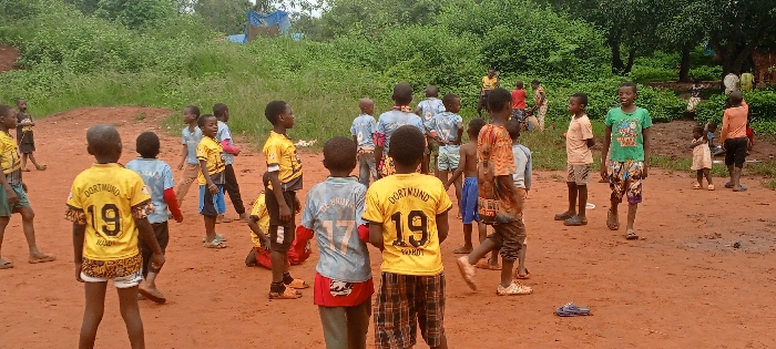 A group of children gather on a dirt ground. Many wear soccer jerseys; some sport the yellow and black of Dortmund, while others wear blue jerseys. They appear to be standing and observing, possibly about to play a game. The backdrop features lush green foliage, and some buildings/dwellings are partially visible. The scene captures a moment of community and activity in what seems to be a rural setting.