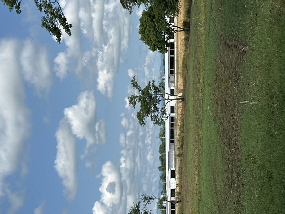 The scene depicts an outdoor rural or agricultural landscape under a partly cloudy sky, identified as being in the city of Las Marías, Mexico. The foreground consists of an uneven field with patches of green grass and areas of disturbed brown earth, suggestive of tilling or recent vegetation management. In the midground, a continuous line of at least five connected or adjacent single-story structures with white or light-colored facades is visible. These buildings feature dark, uniformly spaced rectangular openings along their length and have a light-colored, possibly metallic, roof structure. Several deciduous trees with green foliage are irregularly spaced in front of and around these structures. The background reveals a distant range of low-lying hills or mountains, partially obscured by atmospheric haze. Faint utility poles or power lines are discernible above the buildings. The sky, occupying the upper two-thirds of the image, is blue with numerous scattered white cumulus clouds. No human subjects or discernible actions are present within the frame.