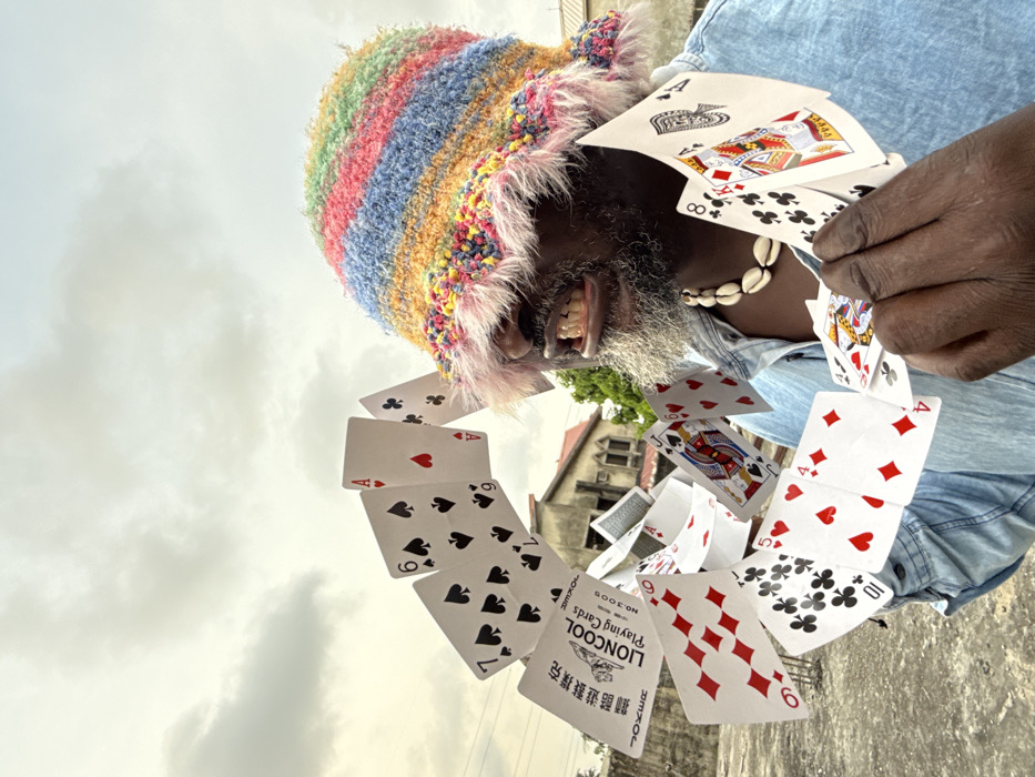 The image captures a dark-skinned individual outdoors in Ado, Nigeria, appearing to be in the midst of a playing card display