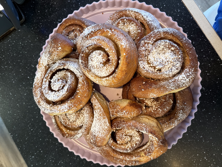 - "The image displays a close-up, high-angle view of a light pink, round platter laden with approximately 12-15 golden-brown cinnamon buns, likely situated on a countertop in Reine, Norway" by FM-AJf9d2, licensed under CC BY 4.0