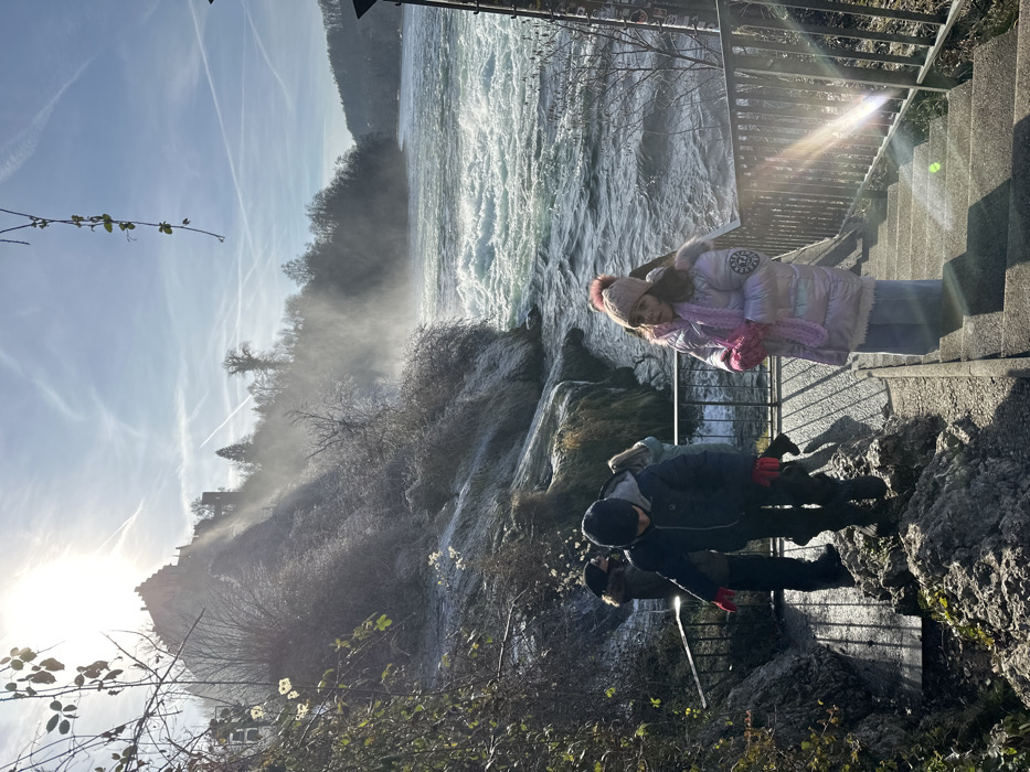 The scene is located at the Rhine Falls in Neuhausen am Rheinfall, Switzerland, on a bright, cold day