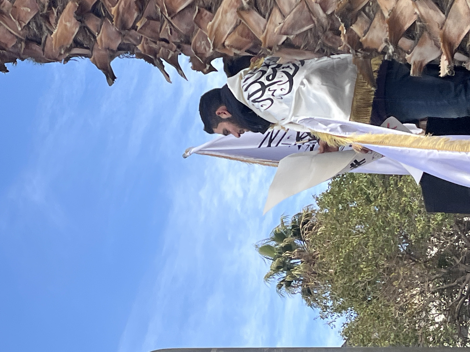 An outdoor scene in As-Salihiya Municipality, Syria, captured during daylight under a clear blue sky with sparse white clouds. The central subject is an adult male, visible from the right side, looking left. He has a dark beard and hair, wearing a dark garment around his neck, a dark shirt, and dark blue jeans. Over his upper body, he wears a white garment or sash adorned with black Arabic calligraphy on the back and a gold fringe along the lower edge. He is holding a white banner, partially obscured, in his left hand. Directly behind him, to his left, is a white flag mounted on a pole, bearing black Arabic calligraphy, likely the Shahada. To the right, a large palm tree trunk with textured brown bark occupies the frame. In the background, behind the individual and flags, are two green trees, one appearing to be a palm tree and the other a leafy broadleaf tree. The scene suggests a public gathering or display.
