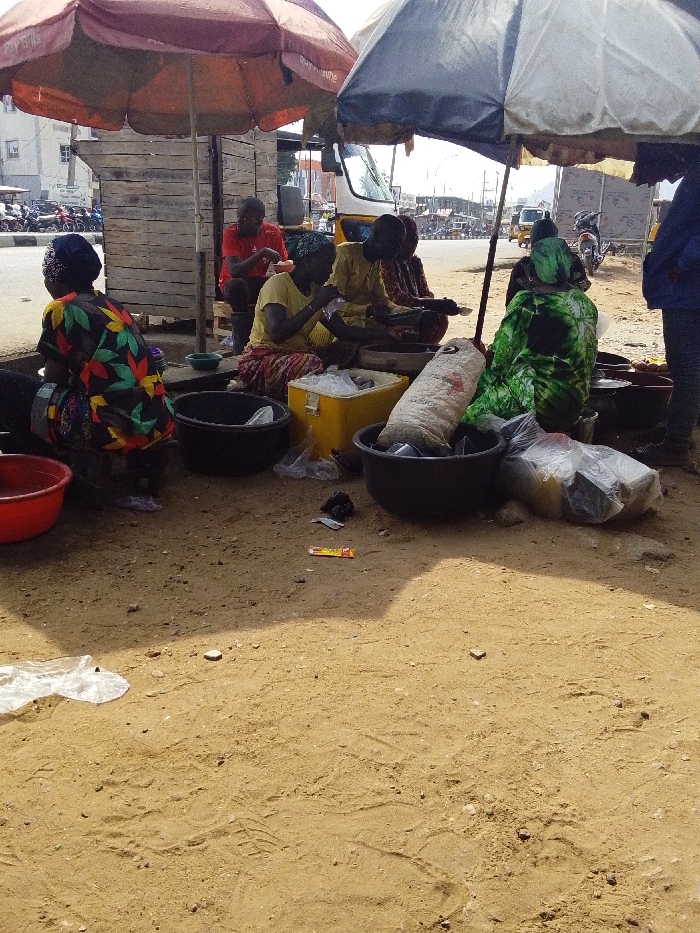 The image displays an active outdoor informal market scene in Lokoja, Nigeria, under daylight conditions