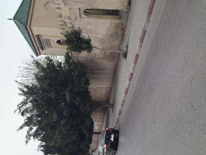 An exterior view depicts a paved asphalt road adjacent to a historic walled complex in Fez, Morocco, specifically the Mausoleum of Sidi Ahmed Tijani
