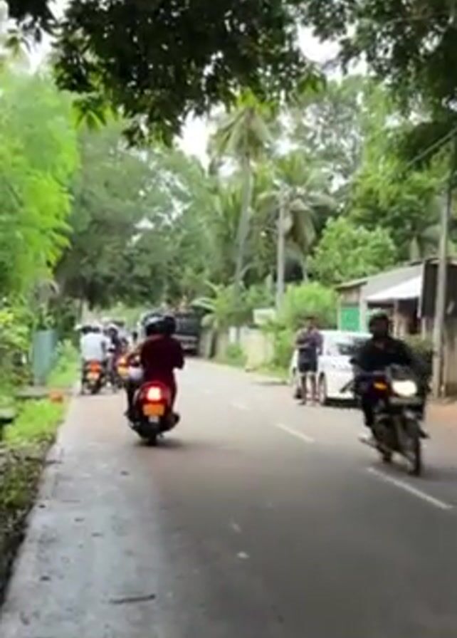 street in what appears to be a tropical or subtropical area. The road is asphalt and has a drainage ditch on the left side. There are several trees and green plants on either side of the road. A number of motorbikes with one or two riders each are driving down the street. A white car is parked on the right side of the road. A man is standing near the car, and another man is walking on the left side of the road. A truck follows the bikes down the road.