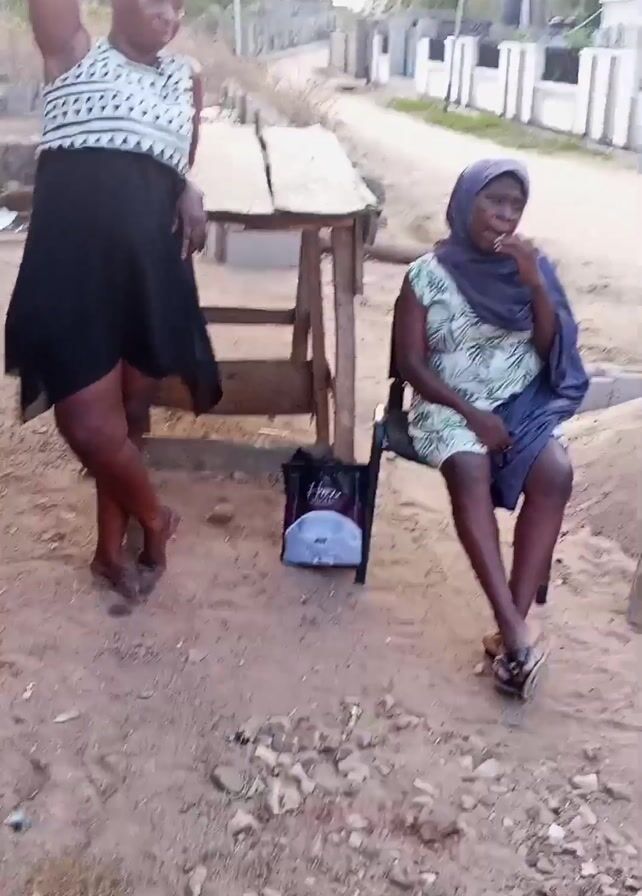 Two women are in an outdoor setting with a dirt and rocky ground. One woman is standing barefoot, wearing a black dress with a white patterned top, with her left arm raised and hand touching her head. The second woman is seated on a black plastic chair, wearing a light colored patterned dress, a dark-colored headscarf, and slide sandals. She is touching her mouth with her right hand. A simple wooden table sits between them, and a black bag with white lettering is placed on the ground in front of the table. The background includes houses, a street, and some trees.