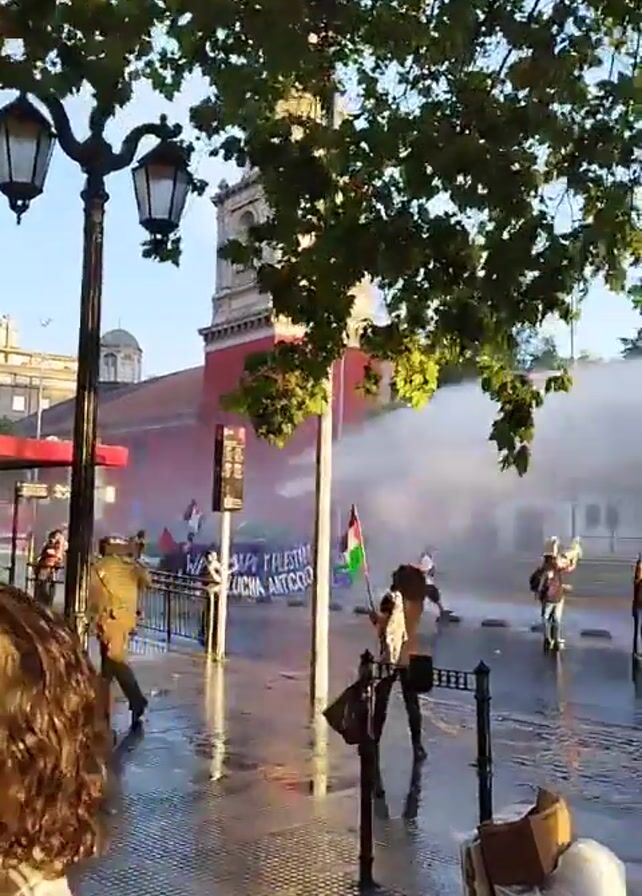 protest in a city street. There is a group of people behind a metal fence, some of whom are holding Palestinian flags. A water cannon is spraying water toward the protesters. One protester is seen running away from the water. The street is wet, and there are some trees and a streetlight on the sidewalk. A banner is held that says "MAPU Y PALESTINA UNIDOS EN LA LUCHA ANTICOLONIAL" (Mapu and Palestine united in the anticolonial struggle).