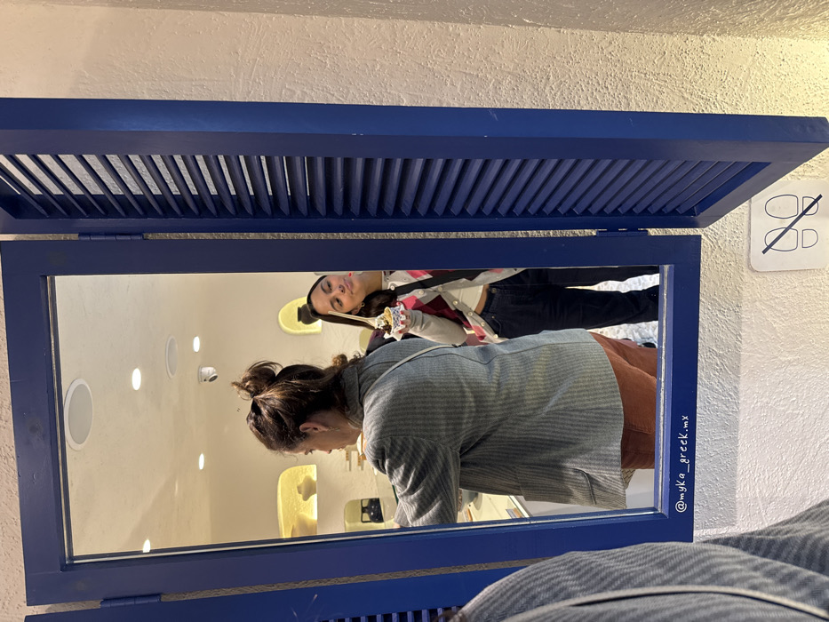 A mirrored reflection shows two women in a bright, white-walled space. The first woman wears a gray striped jacket and rust-colored pants, bending over. The second woman wears a red and white shirt, dark jeans, and holds an object in her hand, appearing to be eating. The mirror is framed by a blue shutter-style border, which covers the top and bottom edges. To the side of the mirror, a sign with glasses and a line through them is visible. "@myka_greek.mx" is written on the right side of the mirror.