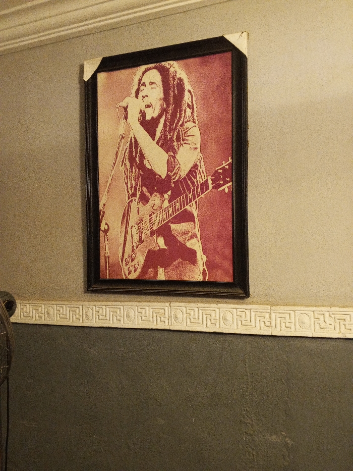 A framed portrait of Bob Marley playing guitar hangs on a wall