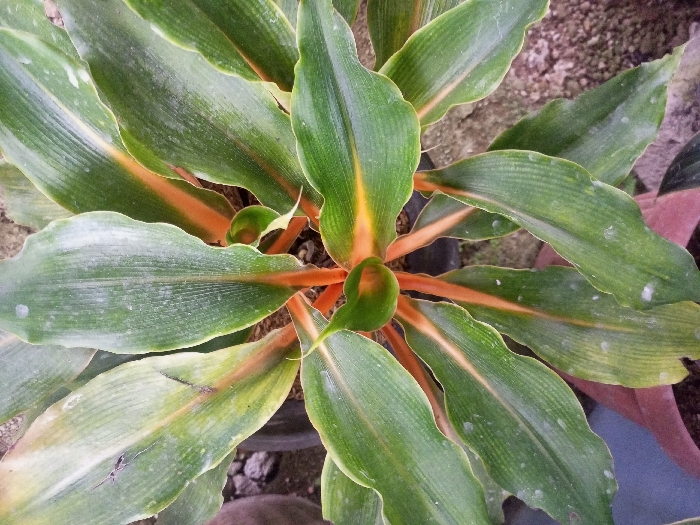 - "A top-down, close-up view depicts a plant characterized by elongated, ribbed green leaves with prominent orange and yellow variegation along the central veins and petioles" by FM-K9h182, licensed under CC BY 4.0