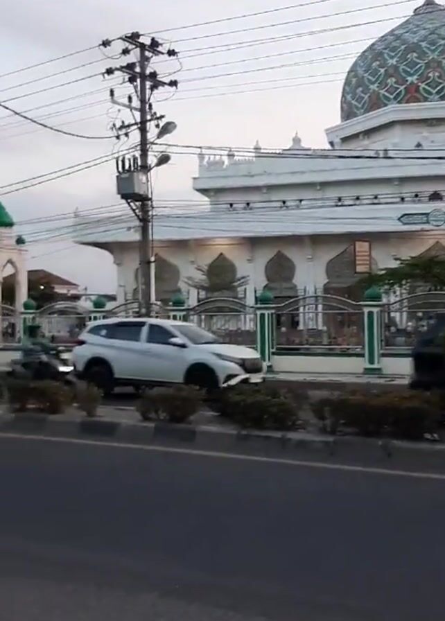 street view of a mosque. The mosque is white with a large dome with intricate green and red patterns. There are green domes around the property. A black car passes in front of the mosque and the video pans to the left showing a small truck, motorcycles, bushes and trees. There are also utility poles visible. The sky is overcast.