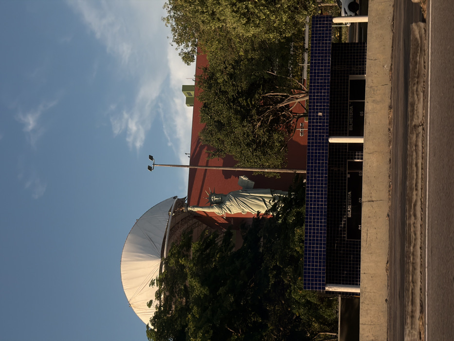The Statue of Liberty replica stands alongside a red building under a partly cloudy sky. A large, white canopy-like structure is adjacent to the statue, partially obscured by trees. A blue tiled wall with "BILHETERIA" signs is visible, next to a sidewalk and street. A light pole extends upwards near the building's edge.