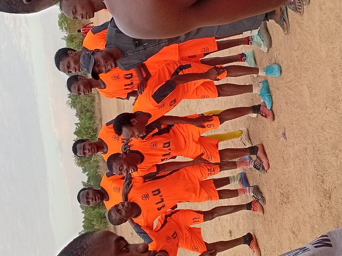 A group of young men wearing matching orange athletic jerseys stand shoulder-to-shoulder on a sandy field. The shirts display "D.T.'S" and a circular logo. Most wear athletic shoes and dark socks. The group appears to be a team or club. The landscape includes a few trees and a hazy sky. Some individuals are partially obscured in the foreground.