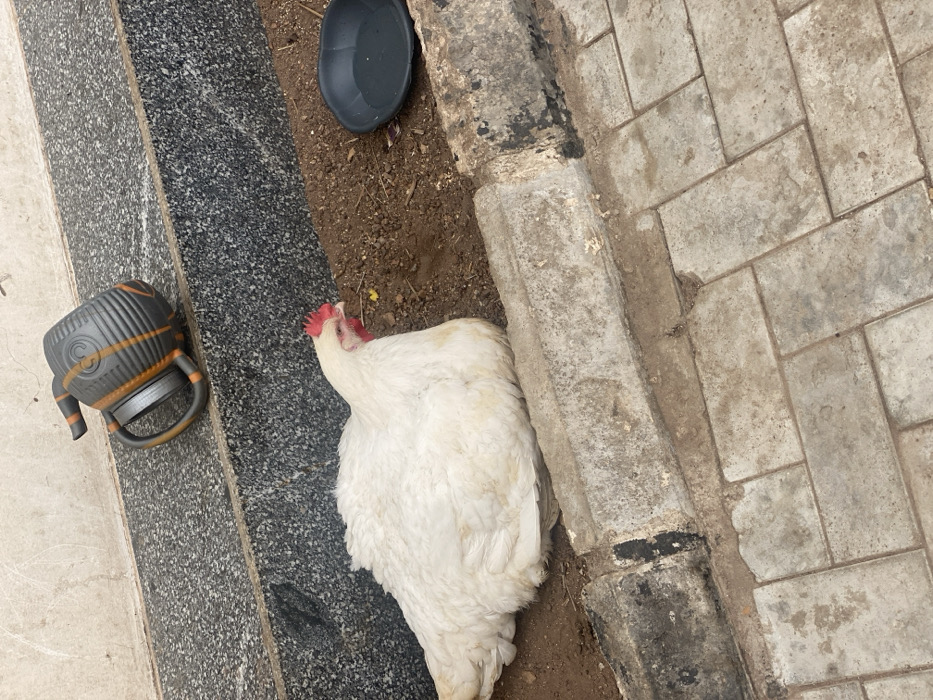 - "A white feathered chicken is observed resting on reddish-brown dirt in the city of Nakuse, Nigeria" by FM-HiVvn1, licensed under CC BY 4.0