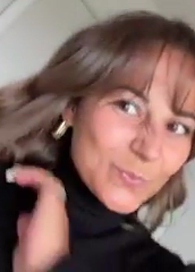A woman with brown hair and bangs, wearing a black turtleneck, looks directly at the camera. She is holding the camera and rotates it, showing her hair from different angles. The background appears to be a bedroom with a bed and a wooden cabinet.