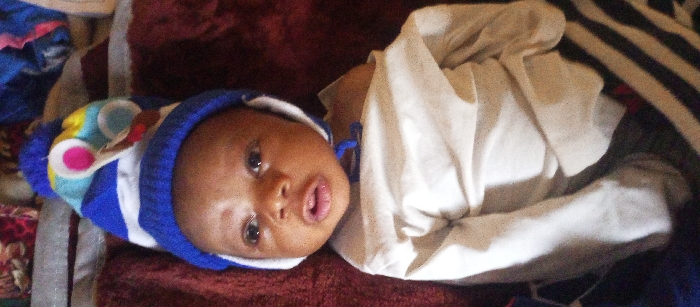 The image depicts an infant, located in Sabon Tasha, Nigeria, lying on its back