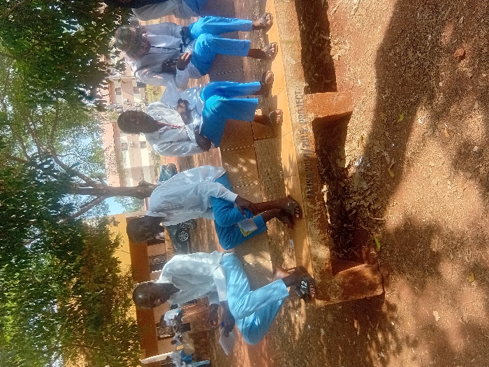 Five individuals in white shirts and blue trousers are seated on a long concrete structure, possibly a low wall or bench. The structure is bordered by a trench filled with debris and dirt. The setting appears to be an outdoor area, maybe a schoolyard. A tree casts shadows over the scene. A building, potentially a school, is visible in the background along with a parked car. The photo is taken in bright sunlight.